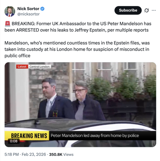 The arrest of Peter Mandelson marks one of the most dramatic developments in British political life in recent years. Once regarded as one of the chief architects of New Labour and a dominant figure in government under Tony Blair and Gordon Brown, Mandelson now finds himself at the centre of a criminal investigation concerning alleged misconduct in public office and ties to the Jeffrey Epstein sex crime conspiracy.