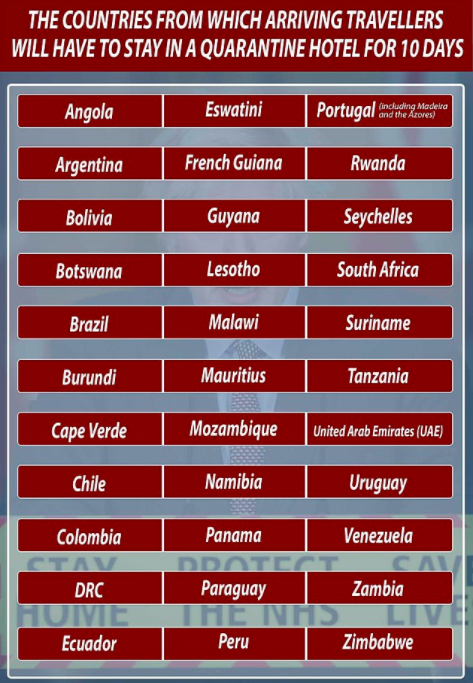 Wszyscy podróżni przybywający do Wielkiej Brytanii z jednego z krajów znajdujących się na „czerwonej liście” zostaną zabrani bezpośrednio z samolotu do pobliskiego hotelu, potwierdził Boris Johnson. BBC przewiduje, że ta procedura dotyczyć będzie około 1000 osób dziennie. Hotele będą strzeżone, by podróżni nie mogli ich opuścić. Zostaną nałożone grzywny w wysokości od 5 000 GBP do 10 000 GBP w przypadku przyjezdnych, którzy nie odbędą kwarantanny w wyznaczonym hotelu.