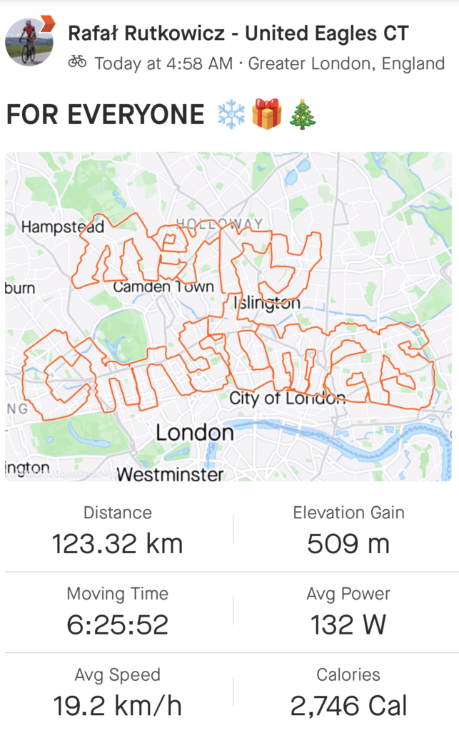 Kilka dni temu internet obiegła informacja, że grupa polskich kolarzy przejechała w okolicach Londynu ponad 120-kilometrową trasę, wzdłuż której za pomocą śladów GPS utworzyli napis: „Merry Christmas”. Skontaktowaliśmy się z Rafałem Rutkowiczem, prezesem United Eagles Cycling Team, by dowiedzieć się coś więcej o klubie, który w tak oryginalny sposób postanowić świętować Boże Narodzenie.