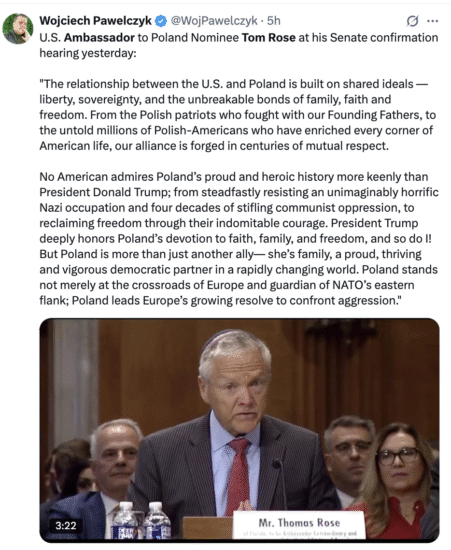 During the Senate hearing, Rose said that Poland „is the guardian of NATO’s eastern flank…our strongest ally in Europe…not just another American ally… she is much more. Poland is family.”