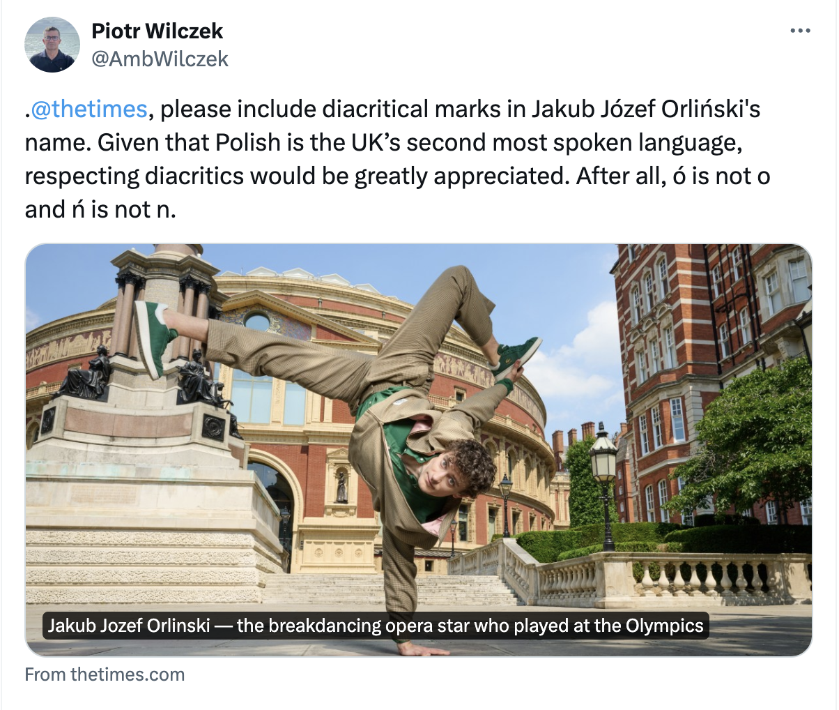 “@thetimes, please include diacritical marks in Jakub Józef Orliński’s name. Given that Polish is the UK’s second most spoken language, respecting diacritics would be greatly appreciated. After all, ó is not o and ń is not n,” the ambassador said in his comment on X.