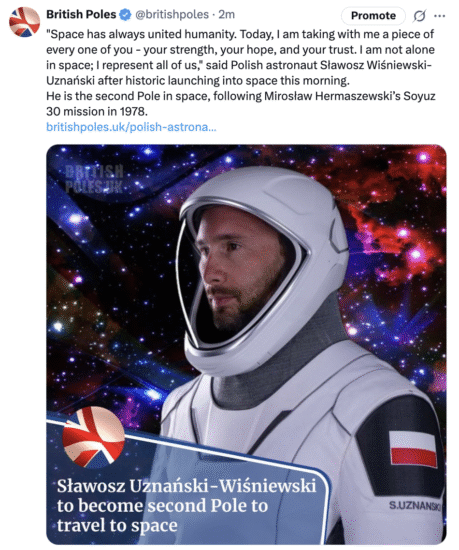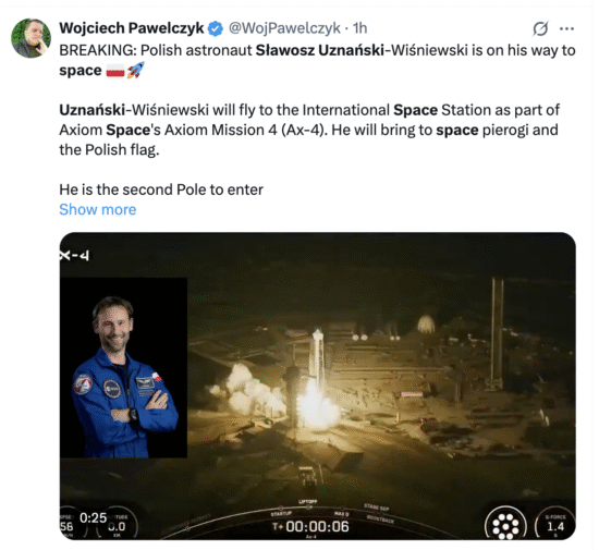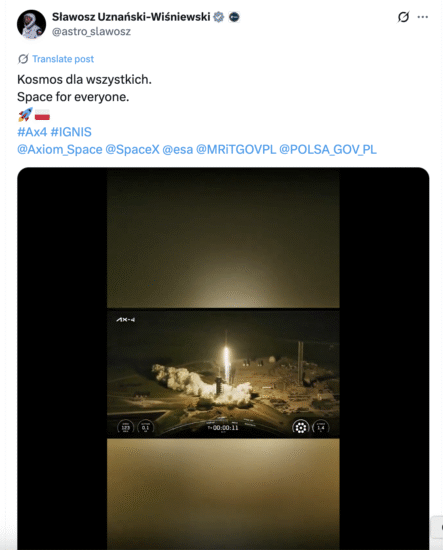 “He’s off! Sławosz Uznański-Wiśniewski (@astro_slawosz) becomes the second Pole in history to venture into space. It’s a historic moment not just for Poland, but for European science and technology as a whole. We’re wishing the crew a safe mission and return. Sławosz, we’re with you!”