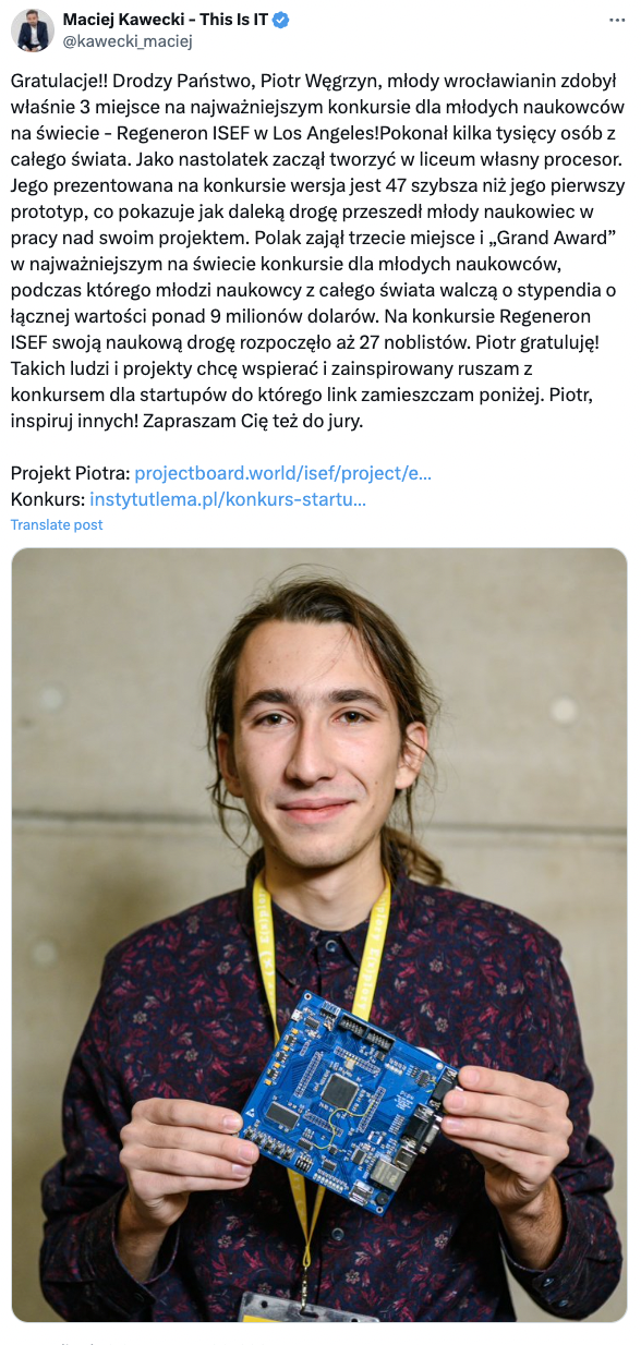 Piotr Węgrzyn, a computer science student at the University of Wrocław, won 3rd place in the prestigious Regeneron ISEF competition in Los Angeles, known as the most important competition for young scientists worldwide. He presented his PCPU processor, which was noticed and awarded by the international jury.
