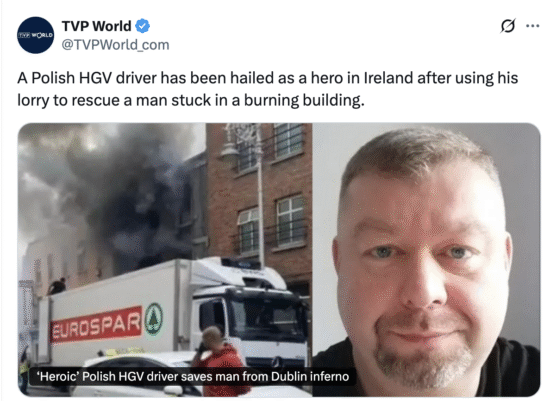 Tomasz Zaręba, a Polish national delivering goods for Eurospar, was passing Granby Row in Dublin 1 shortly after 8 am when he spotted flames erupting from the upper floors of a four-storey residential building. With thick black smoke billowing from a third-floor window and screams piercing the air, Zareba acted without hesitation.