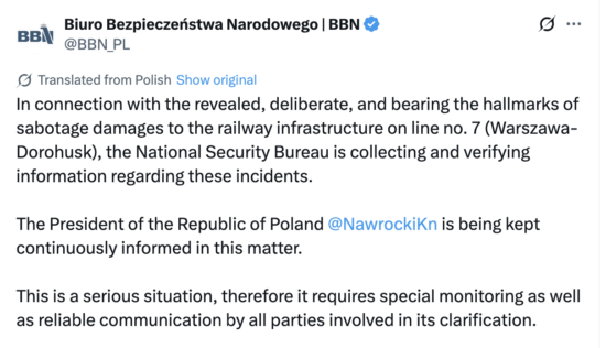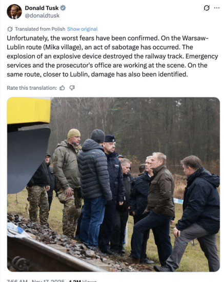Tusk later wrote on X that the deliberate destruction of the Warsaw–Lublin railway line was “an unprecedented act of sabotage targeting the security of the Polish state and its citizens”.