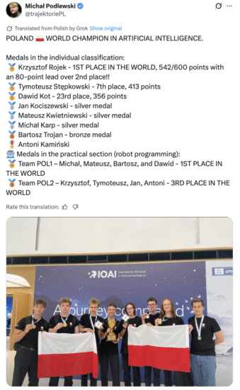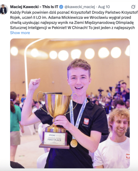 Krzysztof Rojek, a pupil at Adam Mickiewicz High School No. III in Wrocław has taken gold at the International Olympiad in Artificial Intelligence (IOAI) held in Beijing. The event, now in its second year, drew over 280 of the world’s brightest young AI talents from more than 60 countries — including technological powerhouses such as China and the United States, where investment in artificial intelligence runs into billions of dollars.