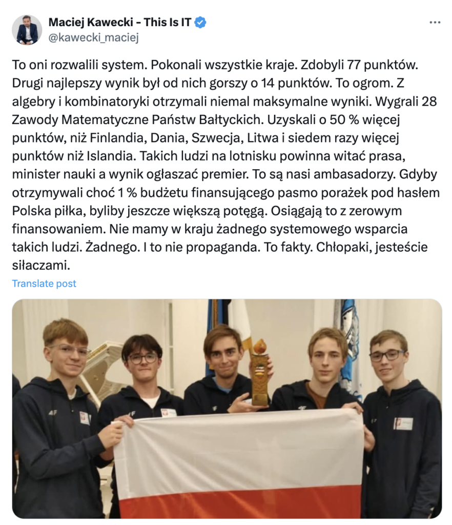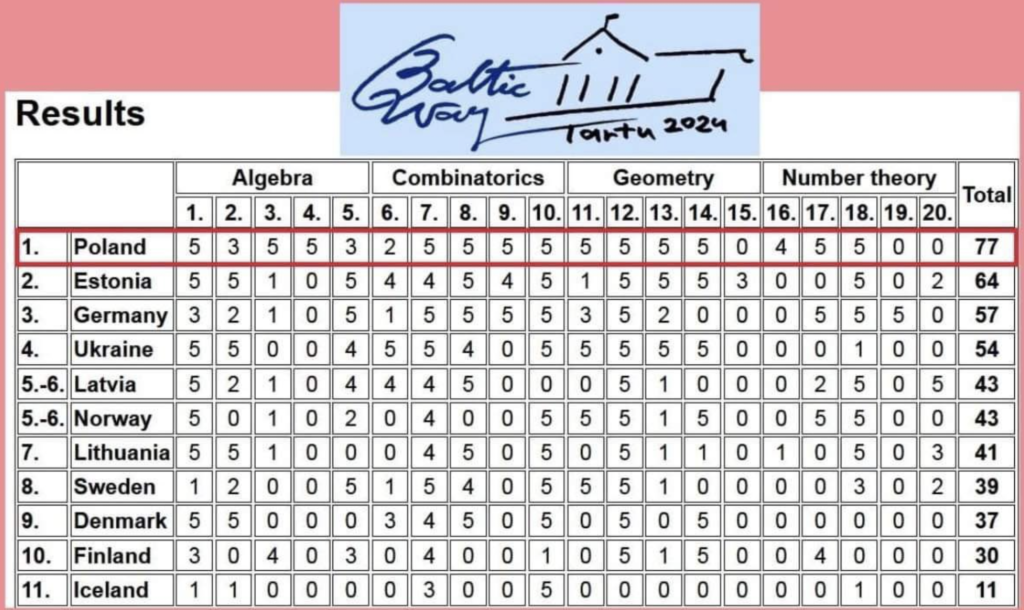 The prestigious mathematics competition „Baltic Way” for high school students is held once a year. In 2024, it took place in Tartu, Estonia on 14-18 November. Poland’s team emerged victorious, earning 77 out of 100 points.