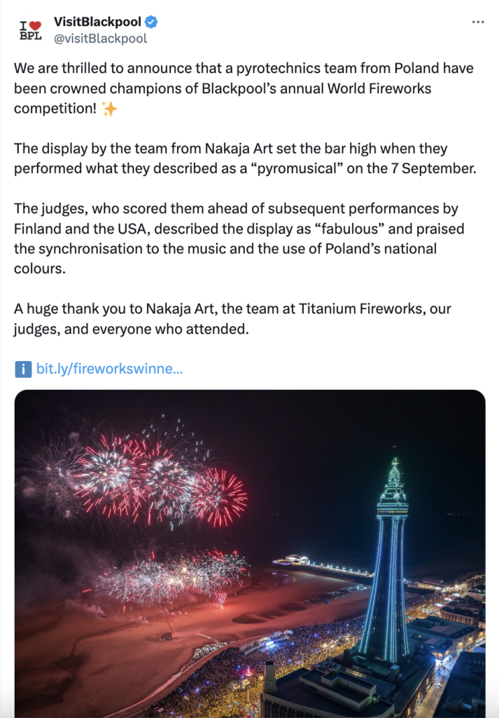 “The judges, who scored them ahead of subsequent performances by Finland and the USA, described the display as “fabulous” and praised the synchronisation to the music and the use of Poland’s national colours. The Polish team have had significant experience of staging firework displays across Europe and Central America, and they were responsible for the biggest fireworks spectacle in their home country, for a Jean Michel Jarre concert in Krakow,” the visitblackpool.com website informed.