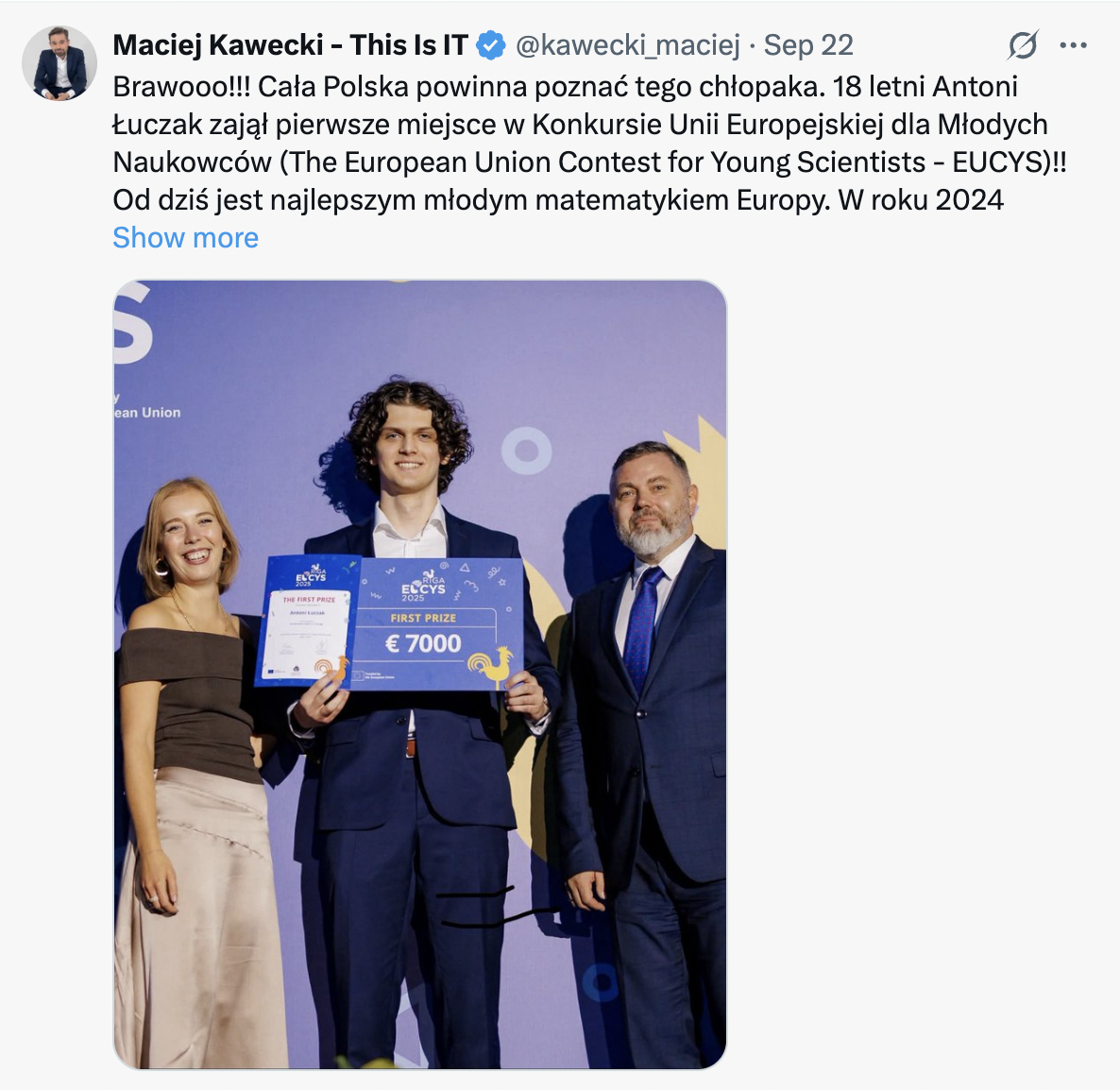 The EUCYS jury awarded Łuczak the top prize, along with a €7,000 grant. This latest distinction adds to an already impressive list of achievements. While still at school, he was a multiple laureate of the Polish Mathematical Olympiad, earning a gold medal in the Junior edition in 2021. He also triumphed in the national qualifiers for EUCYS 2025 and claimed gold at the 46th Paweł Domański Student Research Competition in 2024.