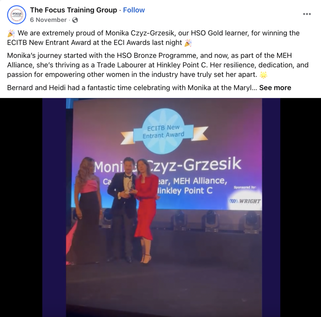 “Winning the award is motivating. I can see all that hard work was worthwhile. I was working in a school canteen to fit around school hours to help take care of my children, but when they reached the age of nine a year ago I decided to move back to a career path and try something new. That’s why I decided to give it a go with Hinkley Point C. I can say it was the best decision of my life, it’s been great,” Monika said after receiving the prize.