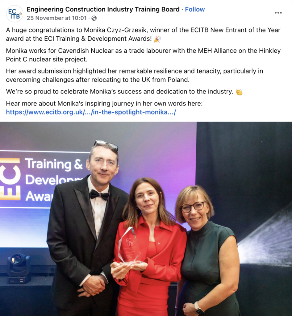 “Monika Czyż-Grzesik, who works for Cavendish Nuclear as a trade labourer for the MEH Alliance on the Hinkley Point C project, was named ECITB New Entrant of the Year at the 12th annual ECI Training and Development Awards in London,” the Somersetlive.co.uk informed.