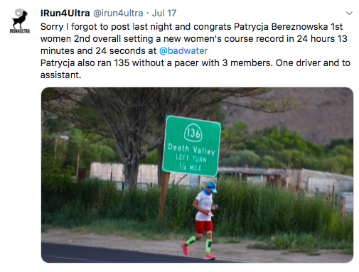 Jak podaje Magazyn Sportowiec polska biegaczka Patrycja Bereznowska wygrała zawody w Dolinie Śmierci, które uważane są za najtrudniejszy ultramaraton na świecie. „Badwater Ultramarathon”, to zawody odbywające się od 1987 roku. Bereznowska przebiegła dystans 217 kilometrów w czasie 24 godzin, 13 minut i 24 sekund. Pobiła tym samym o ponad 1,5 godziny dotychczasowy rekord tego maratonu.