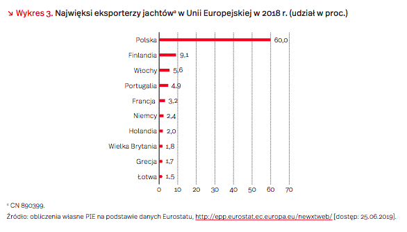 Polski przemysł jachtowy niezaprzeczalnie podbił unijny eksport. Jak podaje Eurostat, w 2018 r. stanowił on aż 60 procent ogólnej wartości eksportu jachtów w Unii Europejskiej, a w okresie 2014-2018 udało doprowadzić się do jego podwojenia (ze 184,8 mln EUR do 395,8 mln EUR). Daleko za Polską uplasowały się Finlandia (60 mln EUR, co daje jej 9,1 proc. eksportu UE) i Włochy ze swoimi jachtami (36,7 mln EUR z wynikiem 5,6 proc. udziału w eksporcie unijnym).