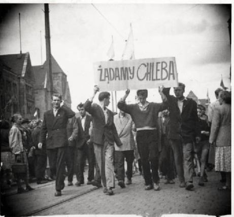 The demonstration slowly took on a national, anti-communist and anti-Soviet character. The following slogans were shouted: „We want bread „, „We are hungry”, „Away with workforce exploitation!”, „We want a free Poland”, „Freedom”, „Away with Bolshevism”, „—we demand free elections under the UN control!”, „Away with Russkis”, „Away with the Russians!”, „Away with communists”, „Away with the red bourgeoisie!”, „We want God”, „—we demand religious classes at school!”. People were also singing the anthem, Rota and religious songs.