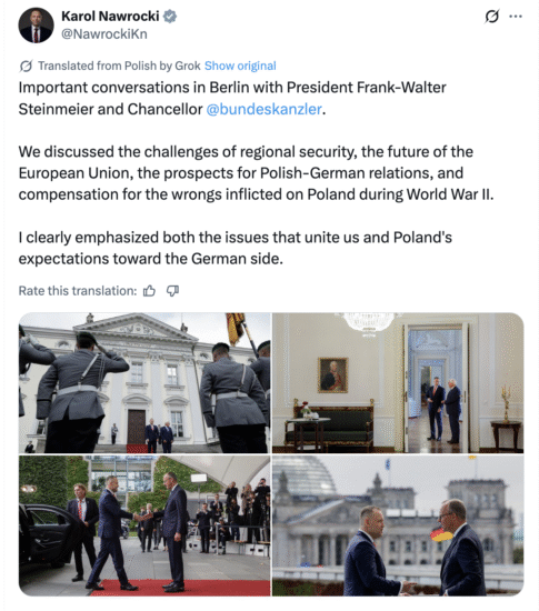In a statement released on the X platform, Nawrocki described the discussions as significant, highlighting that they covered “regional security challenges, the future of the European Union, prospects for Polish-German relations, and the issue of compensation for the harm caused to Poland during the Second World War.”