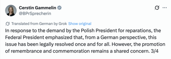 At his meeting with Nawrocki, President Steinmeier stressed that, from Berlin’s perspective, the question of wartime reparations is legally closed, presidential spokeswoman Cerstin Gammelin reported. She added on the X platform that, “in response to the Polish president’s demand for reparations, the German president underlined that for Germany this matter has, in legal terms, been definitively settled.” This has long been the German government’s position.
