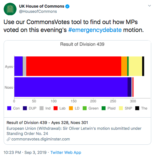 Wyniki głosowania ogłoszone przez @HouseofCommons na Twitterze: