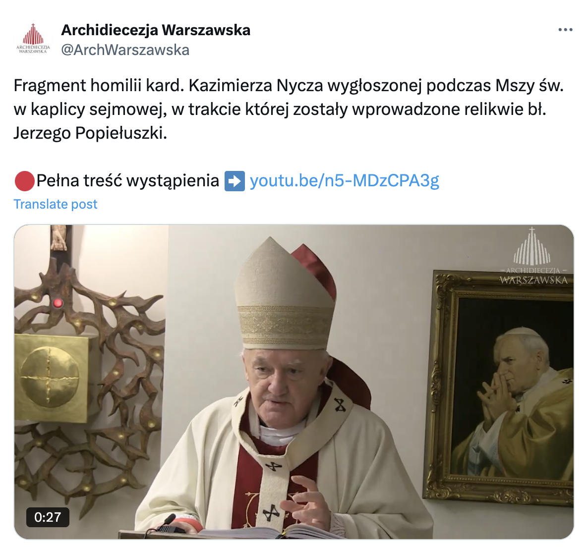 The Chaplain of Polish Parliament Priest Andrzej Sikorski, stressed that the act of introducing the relics of the blood of Bl. Father Jerzy is the completion of an act that began in 1997, when his mother gifted the Polish Parliament a cross from the tomb of priest Jerzy. Today, that cross hangs in the main Chamber of Polish Sejm.