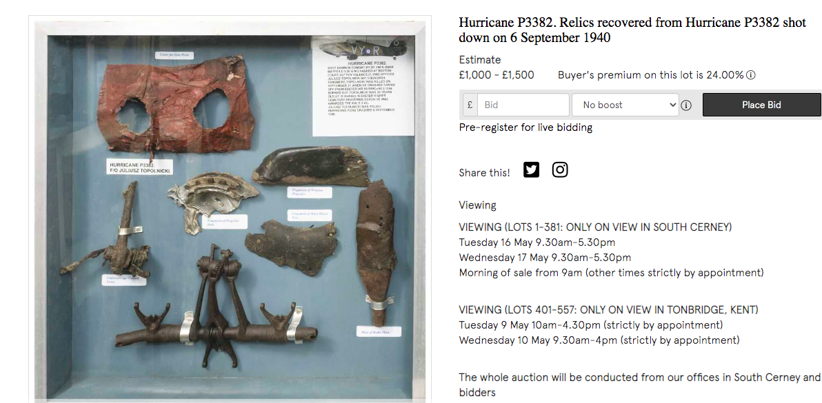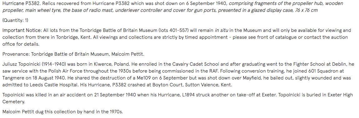 The artefacts retrieved from the wreckage of Hurricane P3382 are currently up for auction at the Tonbridge Battle of Britain Museum. Malcolm Pettit, one of the foremost 'diggers’ of the 70s and 80s, dug this collection by hand in the 1970s.