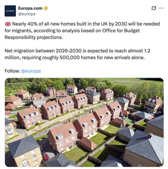 According to the article published by GB News, the claim is based on analysis using official population projections. The report states that “nearly four in 10 new homes built by 2030 will be needed to accommodate migrants arriving in Britain.”