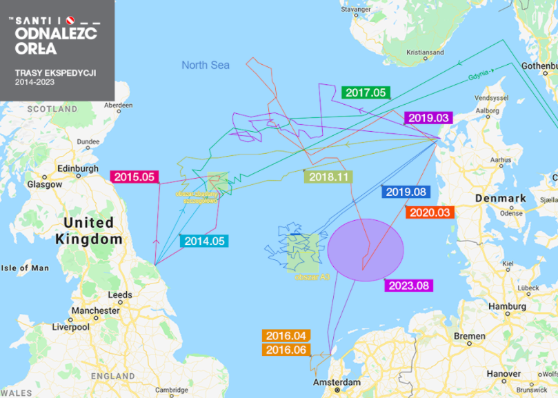 So far, several expeditions have been carried out, focused on testing many hypotheses, including the so-called „Friendly Fire” theory, i.e. the accidental sinking of ORP Orzeł by the British air force. For some time, however, the Santi Find the Eagle team has been focusing on an area of the North Sea around the A3 zone – this is where the submarine should have been located in the first days of her patrol.