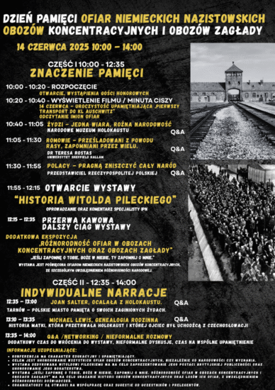 - Prezentacja Joan Salter, ocalałej z Holokaustu (15–20 min) – „Tarnów – polskie miasto pamięta swoich utraconych Żydów”.