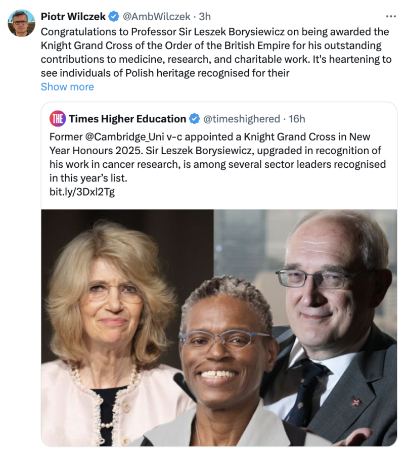 The ex-vice Chancellor of the University of Cambridge and General Director of the Medical Research Council between 2016 and 2023, Professor Sir Leszek Borysiewicz, was honoured with the Knight Grand Cross for “recognition of his work in cancer research”.