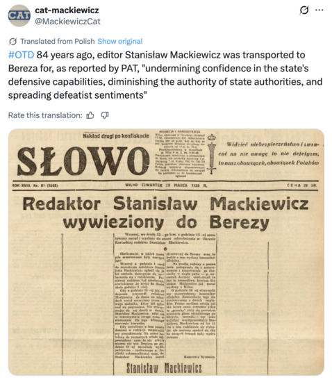 Shortly before the start of the Second World War, Stanisław Cat-Mackiewicz was arrested (as the only Polish journalist) and sent to the infamous Bereza Kartuska camp in response to his articles critical of the insufficient development of the Polish armed forces.