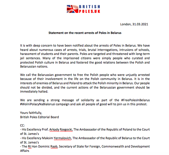 We are sending a strong message of solidarity as part of the #FreePolesInBelarus #WolniPolacyNaBialorusi campaign and ask all people of good will to join us in this protest.