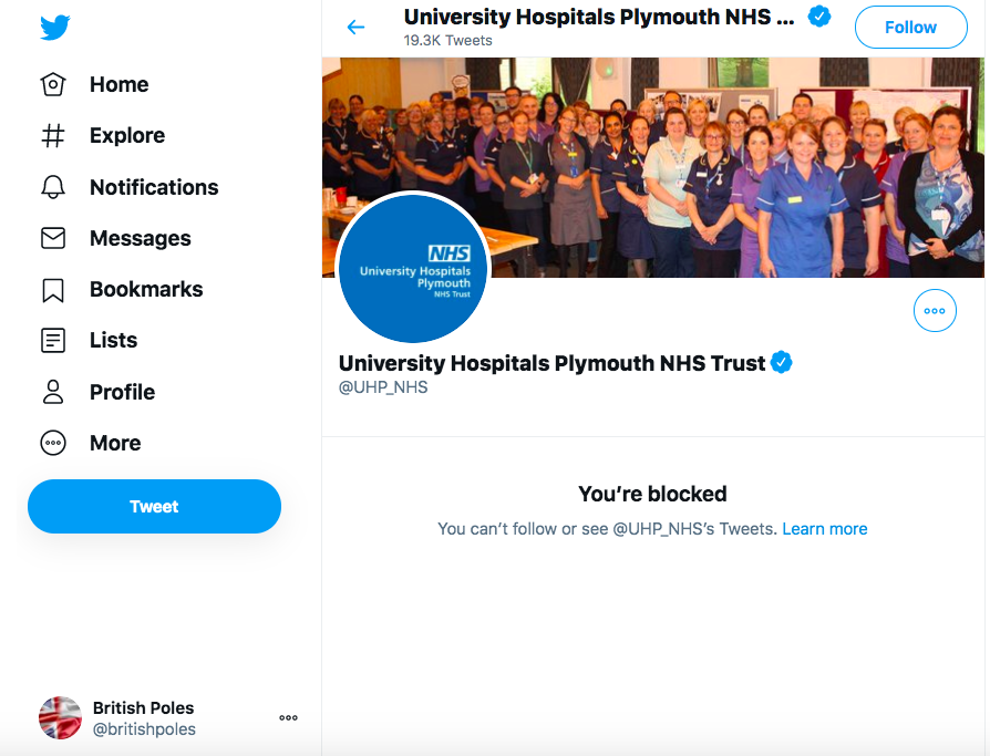 Jakież było nasze zaskoczenie, kiedy wczoraj publikując kolejny artykuł, zatytułowany Czy paszport dyplomatyczny uratuje Polaka umierającego w szpitalu w Plymouth? zorientowaliśmy się, że szpital Derriford w Plymouth ukarał nas za pisanie o zagładzanym Polaku i zablokował naszemu portalowi dostęp do szpitalnego Twittera.