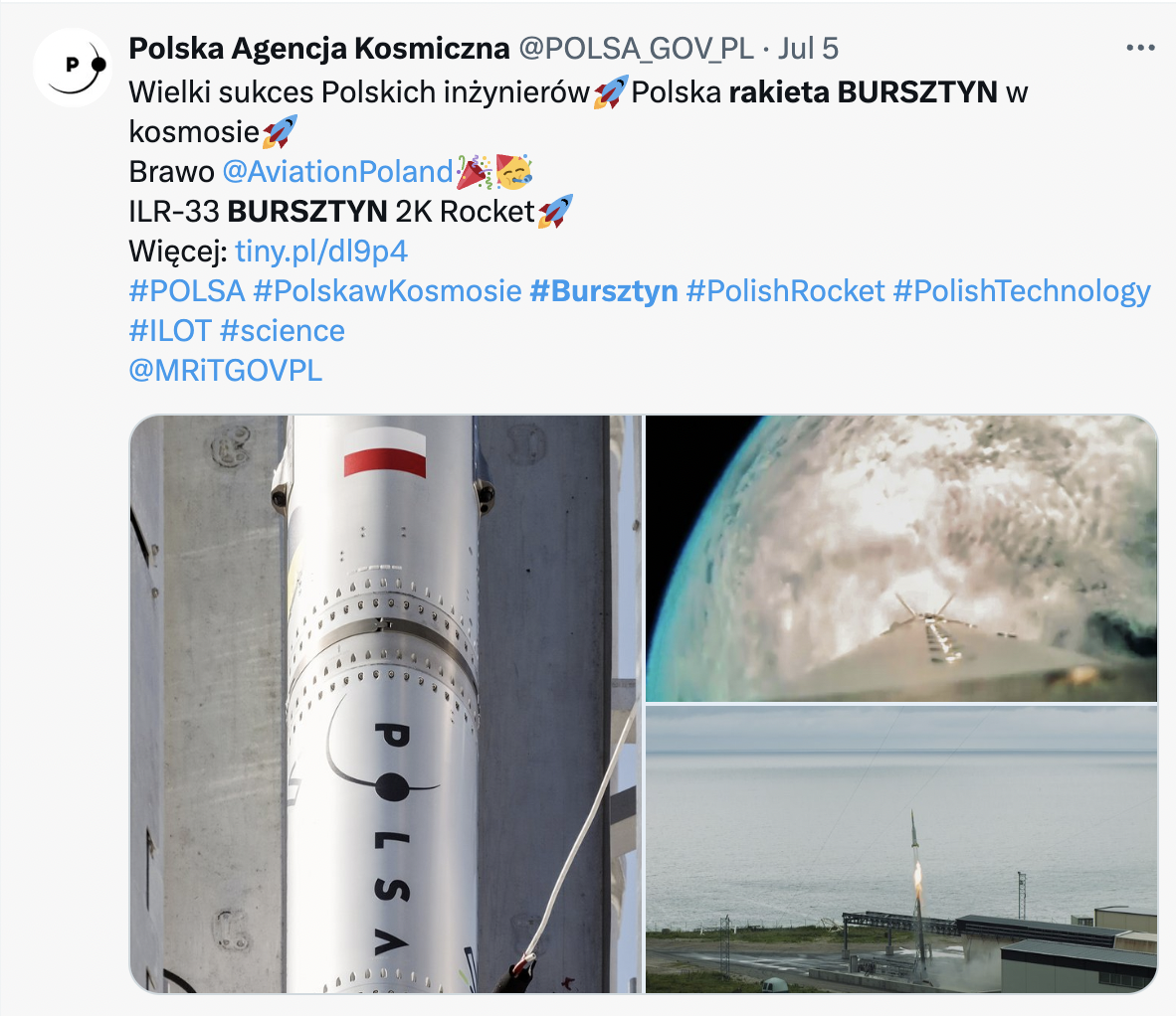 The Polish suborbital rocket ILR-33 Bursztyn 2K reached space. This is a historic achievement for Polish engineers and an important moment for the Polish space industry and the entire space-related sector. The Łukasiewicz Research Network – Institute of Aviation was the institution that developed the project.