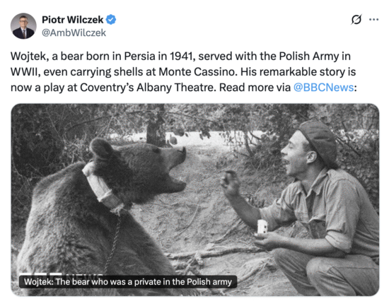 The Polish bear-soldier Wojtek accompanied the Anders Army in its march from Iran to the victorious route through Italy’s battlefields. The Polish soldiers treated Wojtek as a symbol of their unity and courage.