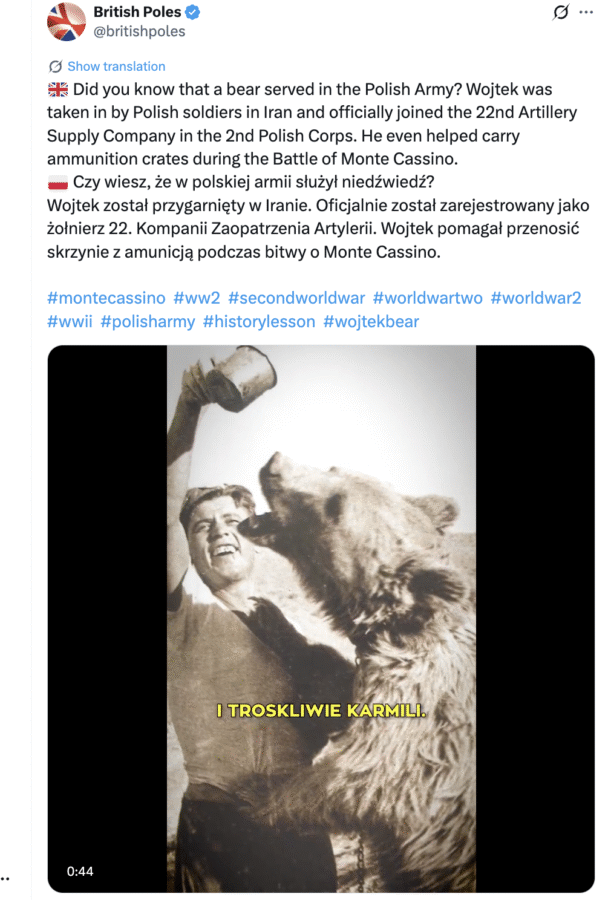 His new name was Wojtek. He quickly became a legend and the hero of many anecdotes passed from mouth to mouth. His fame spread beyond the ranks of the 2nd Polish Corps. The British even made a wartime newsreel about him, that was successfully screened for many weeks in London.