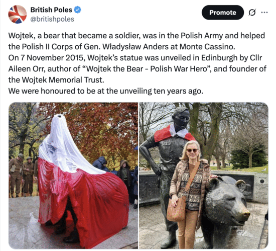 On Saturday, 7 November 2015, a statue of Wojtek the bear a famous comrade of General Anders’ Second Polish Corps soldiers was unveiled in the Princess Street Gardens in Edinburgh city centre. The memorial, which cost around £250,000 was funded by a committee called the Wojtek Memorial Trust.