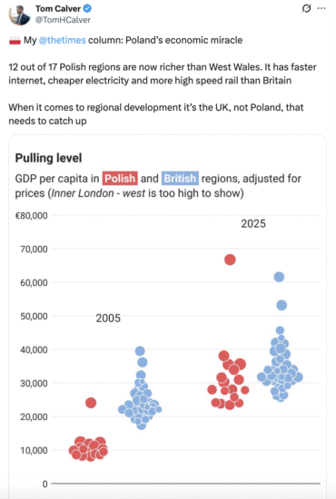 Economists might call this “catch-up growth,” where poorer nations expand faster as they modernise, but Calver argues that Britain could learn from Poland’s dynamism. Data from the EU show that “many parts of Britain have been overtaken by Poland’s more successful areas.”