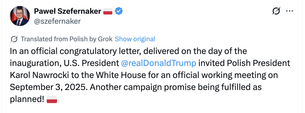 The invitation was first disclosed by the head of the President’s Cabinet, Paweł Szefernaker, who posted on X that Trump extended the offer in a formal letter delivered on Nawrocki’s inauguration day. “Another campaign pledge fulfilled — right on schedule,” Szefernaker wrote.