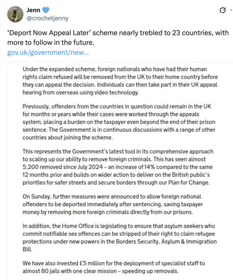 Home Secretary Yvette Cooper said the expansion was designed to stop foreign offenders “exploiting Britain’s immigration system” and to speed up removals.
