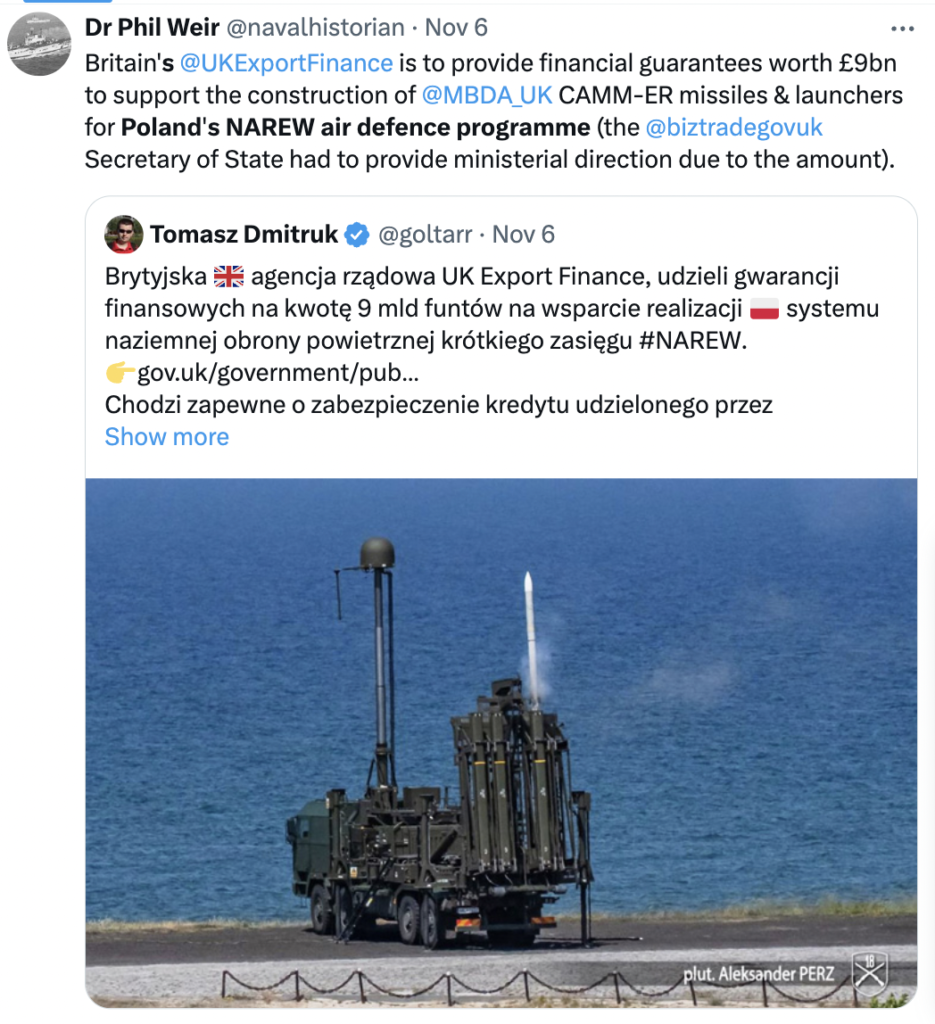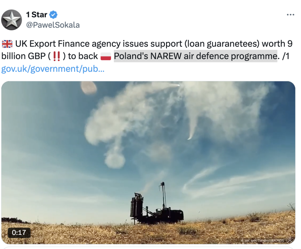 “The UK government supports the export of air defence systems and associated goods and services (the 'NAREW Programme’) by the UK and Polish defence companies MBDA UK Limited and Polska Grupa Zbrojeniowa,” the Export Finance informed in a press statement.
