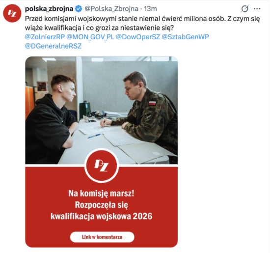 Od 2 lutego do 30 kwietnia 2026 roku na terenie Rzeczypospolitej Polskiej przeprowadzona zostanie kwalifikacja wojskowa. Nie oznacza powołania do wojska.