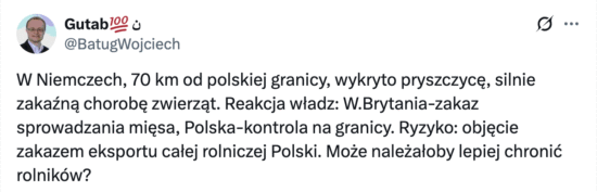 Tom Bradshaw, prezydent Narodowej Unii Rolników (NFU), powiedział, że „dopóki źródło pryszczycy pozostaje niezidentyfikowane w częściach Europy, bardziej rygorystyczne kontrole graniczne są niezbędne.”