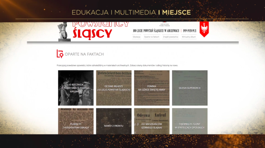 Natomiast miano zwycięskiego projektu w kategorii Edukacja i multimedia otrzymała strona internetowa Powstańcy Śląscy, przygotowana przez Archiwum Państwowe w Opolu oraz Archiwum Państwowe w Katowicach. Strona oparta jest w całości na oryginalnych materiałach archiwalnych. Celem portalu jest przybliżenie bogactwa informacji, skrywanego w archiwach, które dzięki postępowi technologicznemu jest dziś dostępne dla każdego i w każdym niemal zakątku świata oraz upowszechnianie wiedzy o pamięci wspólnej przeszłości Polaków.