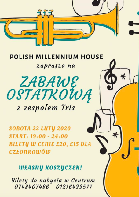Polskie Centrum Millenium House w Birmingham serdecznie zaprasza na Zabawę Ostatkową z zespołem „Trio”.