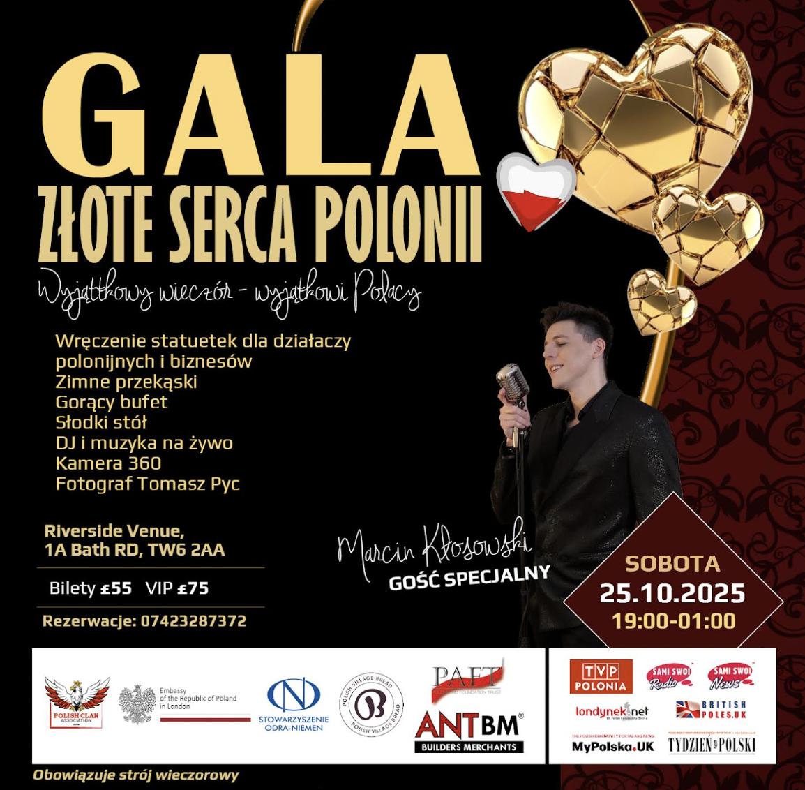 Już 25 października 2025 roku w prestiżowym Riverside Venue (Bath Road, TW6 2AA, Londyn) odbędzie się wyjątkowe wydarzenie – Złote Serce Polonii – Gala Nagród 2025, organizowana przez Polish Clan Association.